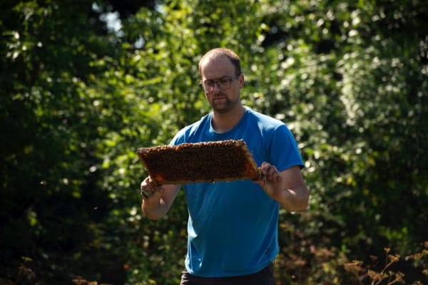 Étudiant en informatique, Eric décide de changer de secteur d’étude en 2007 suite à l’achat d’une terre agricole par son père. Il quitte alors Montréal pour aller étudier au Cégep d’Alma et suivre une formation spécialisée en Exploitation d’une entreprise apicole. C’est lors de cette formation qu’il a vraiment eut la piqûre pour l’apiculture! En 2009, il débute avec 20 ruches. En 2013, il unit ses forces avec ses parents. Désormais, c’est plus de 150 ruches que la ferme gère.